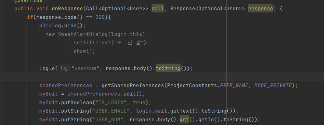 위에서 SharedPreferences에 유저의 고유아이디값을 저장하기 위해 respose.body.getI()~~으로 값을 넣었는데 오류가 나