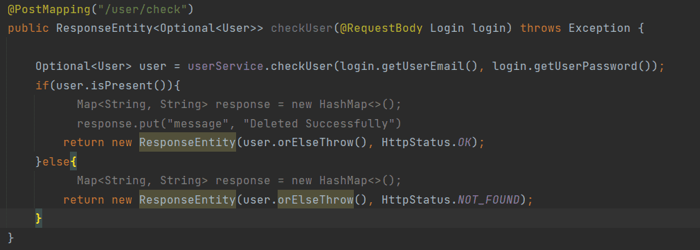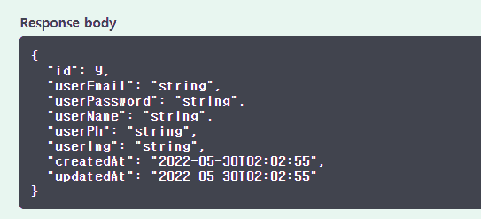 유저의 정보를 찾기 위해 이렇게 작성하였고, swagger으로 값을 찾을때 response body부분이 아래와 같이 나오고