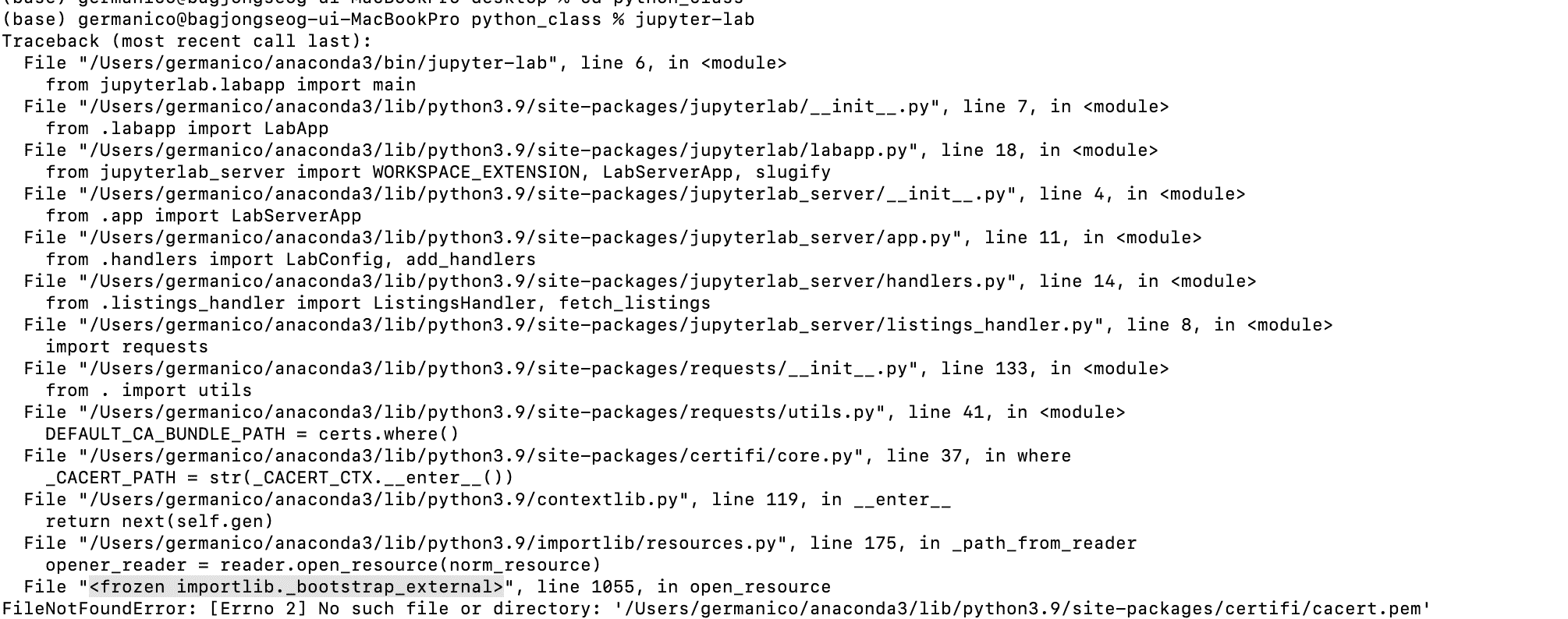 주피터랩 실행 시 아래와 같은 오류가 생기는데..원인을 모르겠습니다ㅠ 혹시 알려주실 수 있을까요