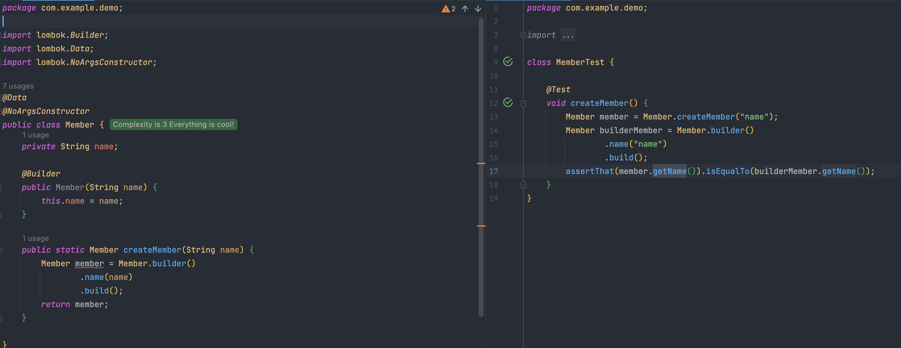 (우측코드의 테스트가 이해가 가지 않으시면, 롬복 빌더로 생성 테스트라고 보시면 됩니다.)