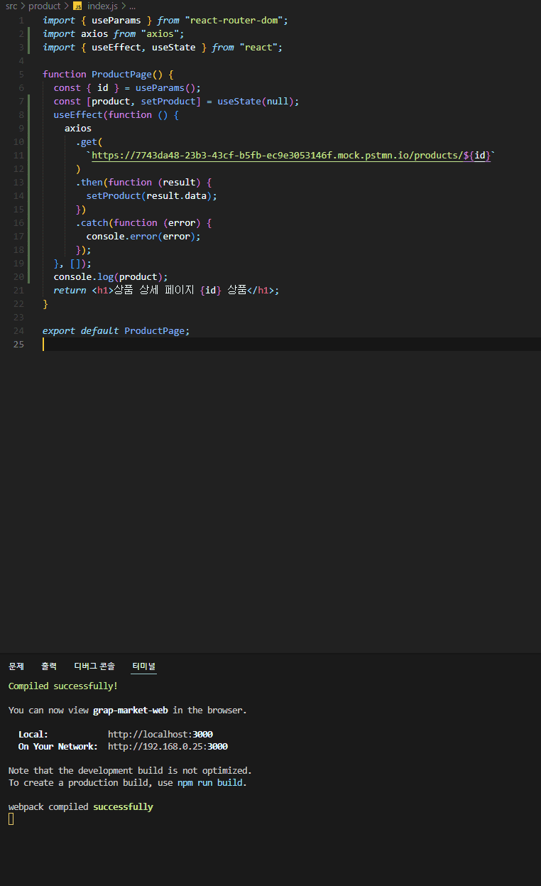 그리고 console.log(product)가 컴포넌트 함수 안에 바로 있으면 내부적으로 렌더링 과정을 거치면서 여러번 불리게 되는 게 맞습니다! (컴포넌트의 라이프사이클이 있어 렌더링이 여러번 진행됩니다) 그래서 한 번만 찍게 하려면 useEffect안에서 호출하는 게 맞습니다 :)