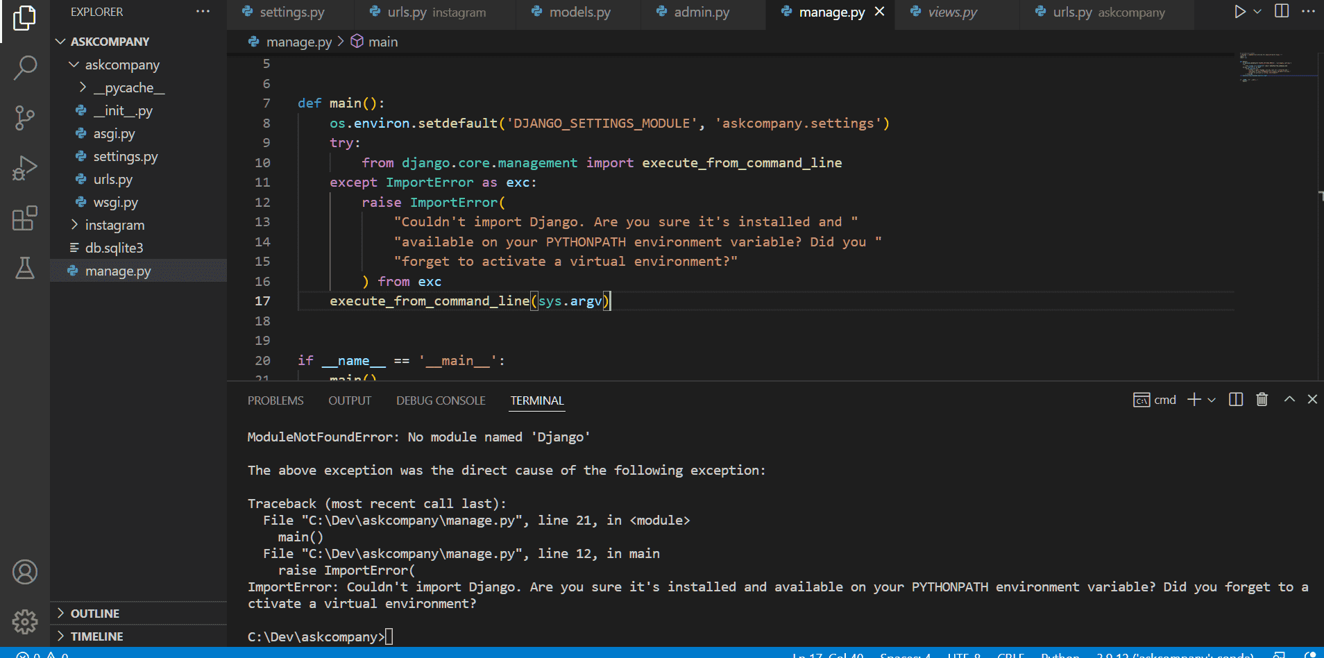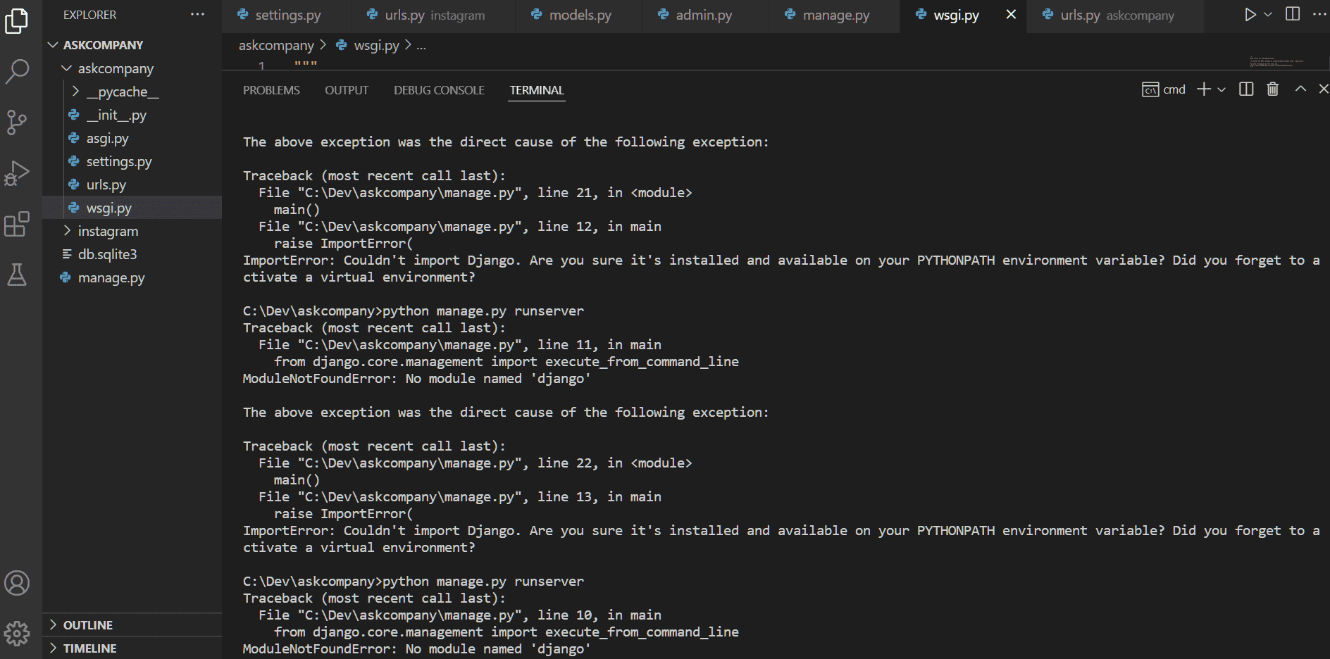현재 vscode 상의 터미널에서의 python 명령이 참조하는 가상환경 혹은 인터프리터에서 django 라이브러리가 없어서 발생하는 이슈입니다.