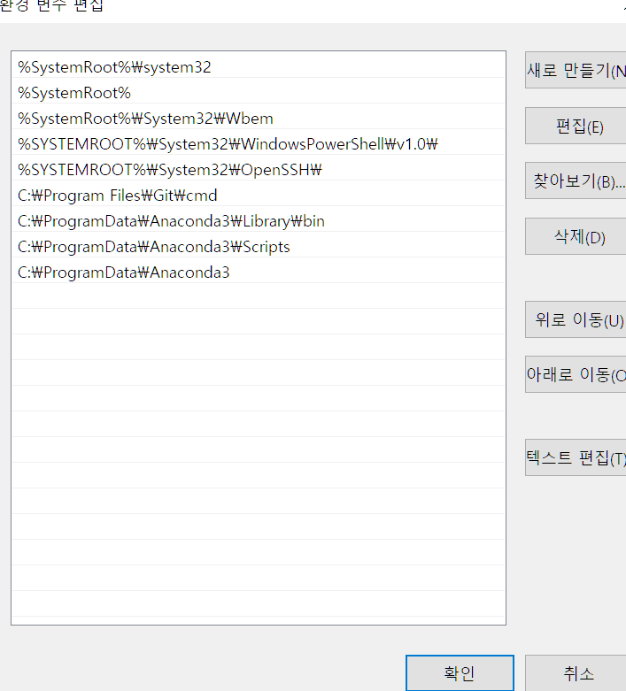 환경 변수 편집에 anaconda3와 관련된 path도 확인 했습니다.