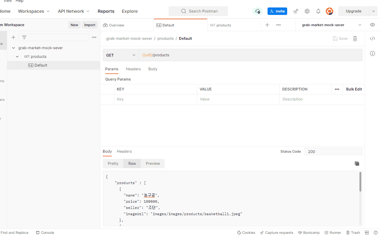 포스트맨에서 클라이언트로 제공하는 데이터는 Array 형태로 되어있고 그 안의 객체들의 imageUrl이 보일 거에요.