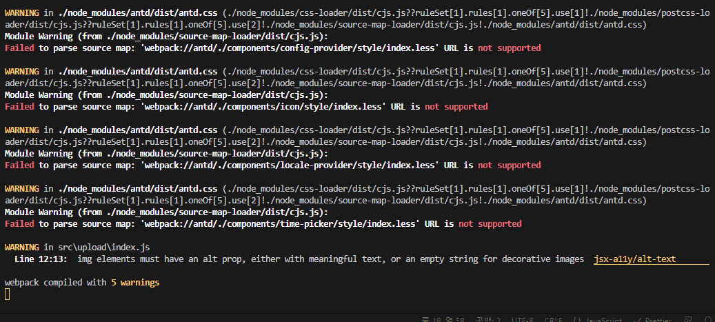 React-Script 5.00 버전 부터는 이와 같은 문제가 발생한다고 하네요. 앞으로는 import를 할 때 import 'ants/dist/antd.min.css'를 넣어줘야 할 것 같네요. warning이 너무 많이 떠서 성능에도 영향을 주는 것 같습니다.