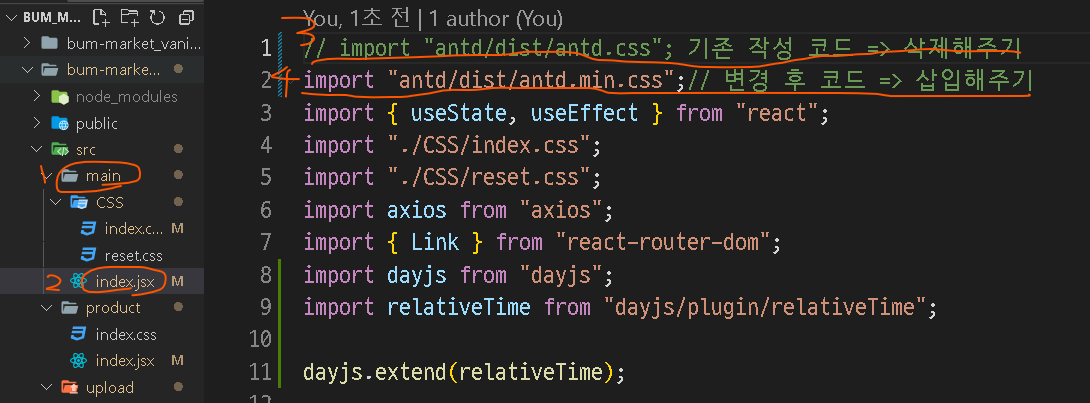 제가 잘 따라서 작성한게 맞다면 App.js가 아니라 main폴더 안에 있는 index.js 파일 안에 가장 상단에 있는 코드를 변경해주어야 합니다. (저는 자동완성 기능을 사용하고 싶어 확장자를 index.jsx로 임의로 변경해주었습니다. index.js 파일과 동일합니다.)