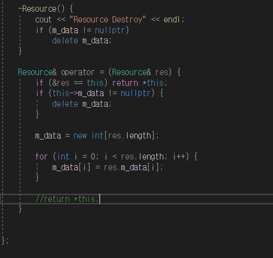제가 생각에는 re의 소멸자랑 re2의 소멸자 그리고 re3에서 만들어진 복사생성자에서 호출하는 Resource(source.length); 여기서만든 생성자랑 re3에서 만들어진 거랑해서 총 4의 소멸자가 호출이 되어야 한다고 생각하는데 1개만 호출이 되서요 왜그런건가요?