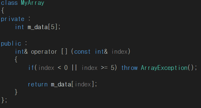 그러면 오버로딩한 [ ] 연산자 함수에서 예외가 발생하여 throw에 의해서 ArrayException타입 객체를 기본 생성자를 호출하여 생성된 객체를 doSomething 함수의 내부에 있는 catch에 넘겨줍니다.