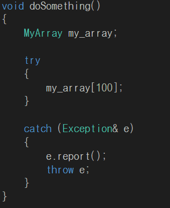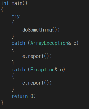 그렇게 되면 catch 옆에 (Exception& e) 처럼 값에 의한 전달이 아닌 참조에 의한 전달로 객체 자체를 넘겨줍니다. 그러면 Exception 클래스를 상속받은 ArrayException객체 자체를 e로 넘겨줍니다. 그리고나서 e.report()를 통해서 report 함수에 구현된 내용이 실행됩니다.