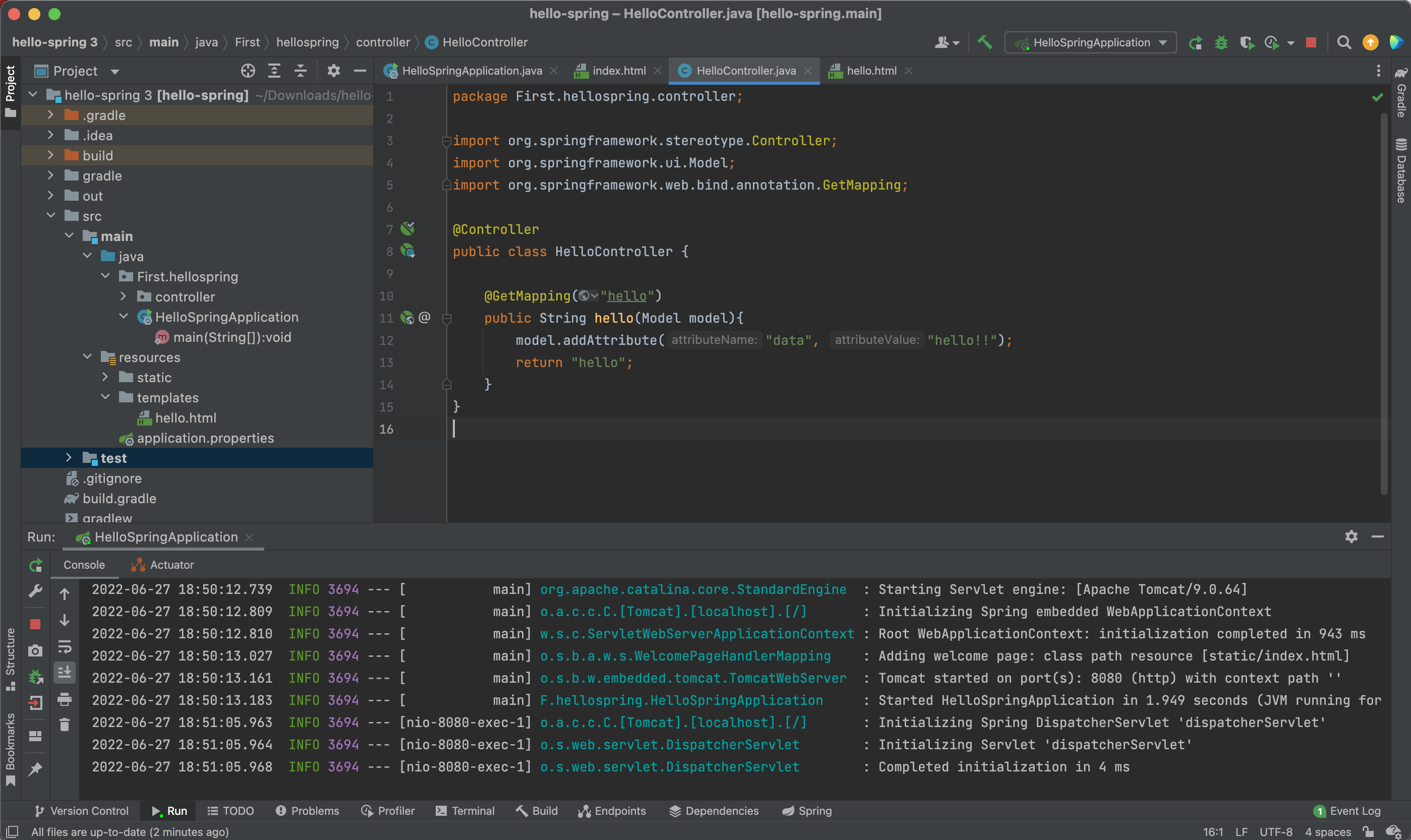 위 코드는 HelloController.java 파일이고, d위 코드는 hello.html 코드입니다.