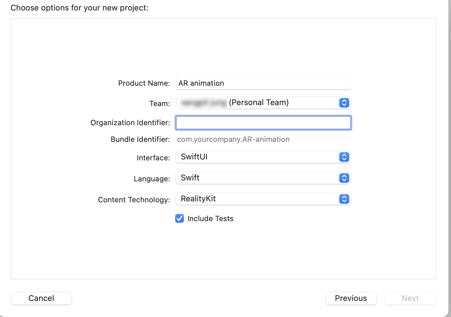 'Xcode에서 AR animation 처리' 영상의 2:29초에 나오는 화면 중 Organization Identifier 에는 무엇을 넣어야 하나요? 영상을 똑같이 따라하는데 다른 설정이 뜹니다