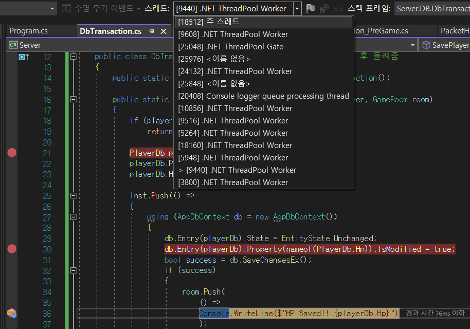 세 지점에 브레이크 포인트를 찍어서 쓰레드를 관찰해봤는데 위에서 차례대로 24132 -> 주쓰레드 -> 9440 이렇게 변화가 있었는데요. 전부 Push로 예약을 하는 입장에서 왜 DbTransaction에 Push한 일감만 주쓰레드에서 처리하는지도 궁금합니다.