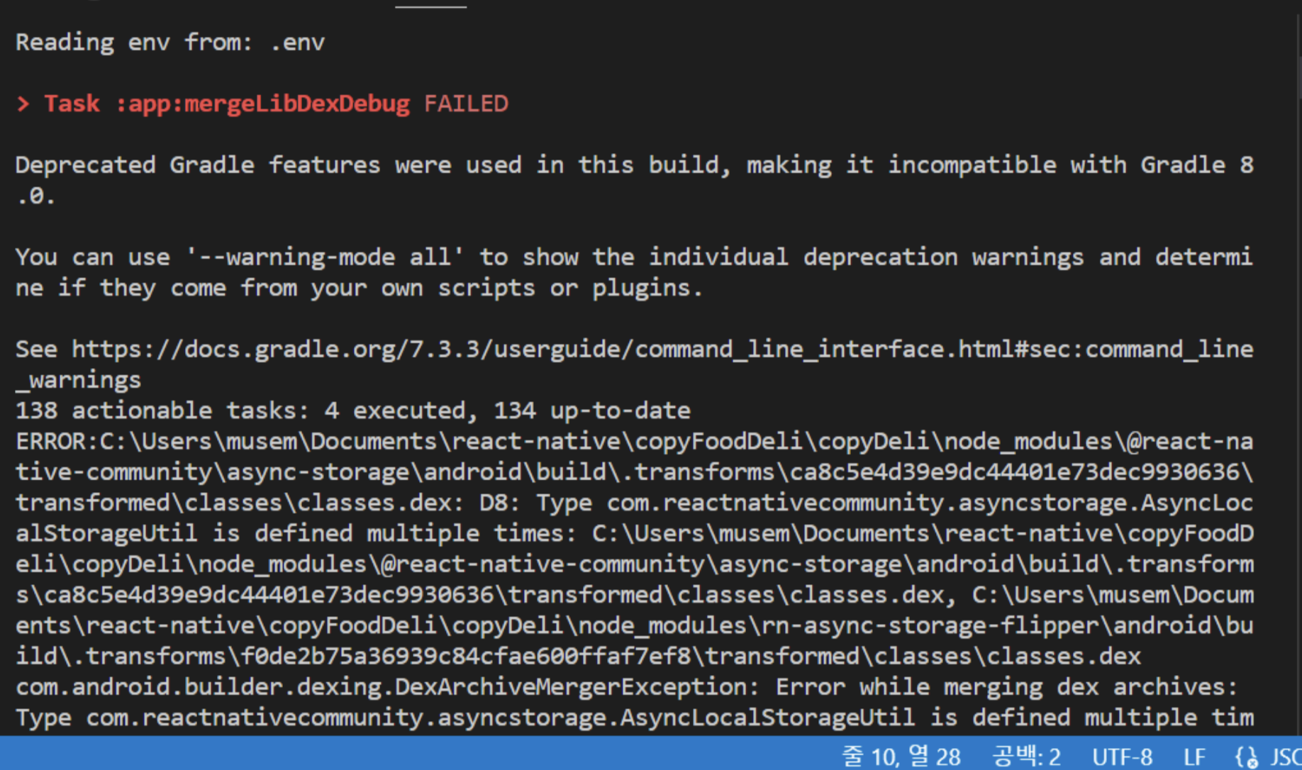 ERROR:C:\Users\musem\Documents\react-native\copyFoodDeli\copyDeli\node_modules\@react-native-community\async-storage\android\build\.transforms\ca8c5e4d39e9dc44401e73dec9930636\transformed\classes\classes.dex: D8: Type com.reactnativecommunity.asyncstorage.AsyncLocalStorageUtil is defined multiple times: C:\Users\musem\Documents\react-native\copyFoodDeli\copyDeli\node_modules\@react-native-community\async-storage\android\build\.transforms\ca8c5e4d39e9dc44401e73dec9930636\transformed\classes\classes.dex, C:\Users\musem\Documents\react-native\copyFoodDeli\copyDeli\node_modules\rn-async-storage-flipper\android\build\.transforms\f0de2b75a36939c84cfae600ffaf7ef8\transformed\classes\classes.dex