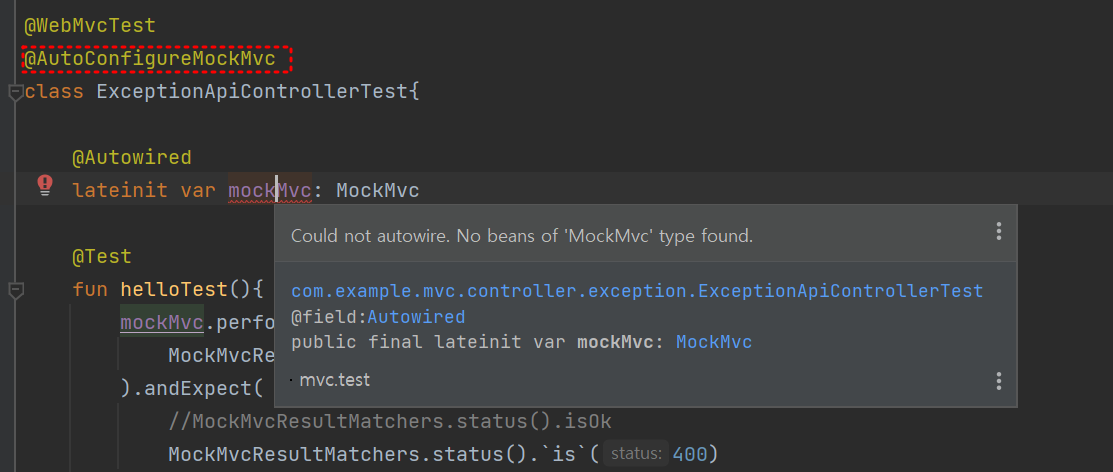위 이미지처럼 mockMvc를 @Autowired하니 에러가 납니다.