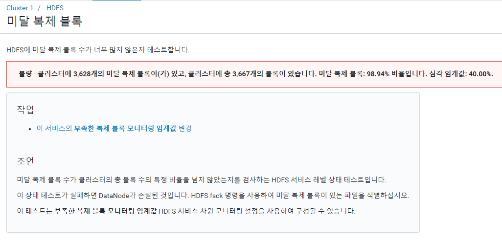 아래와 같이 "Under-Replicated Blocks" 문제가 발생한 경우에는 어떻게 대처를 하면 될까요...?