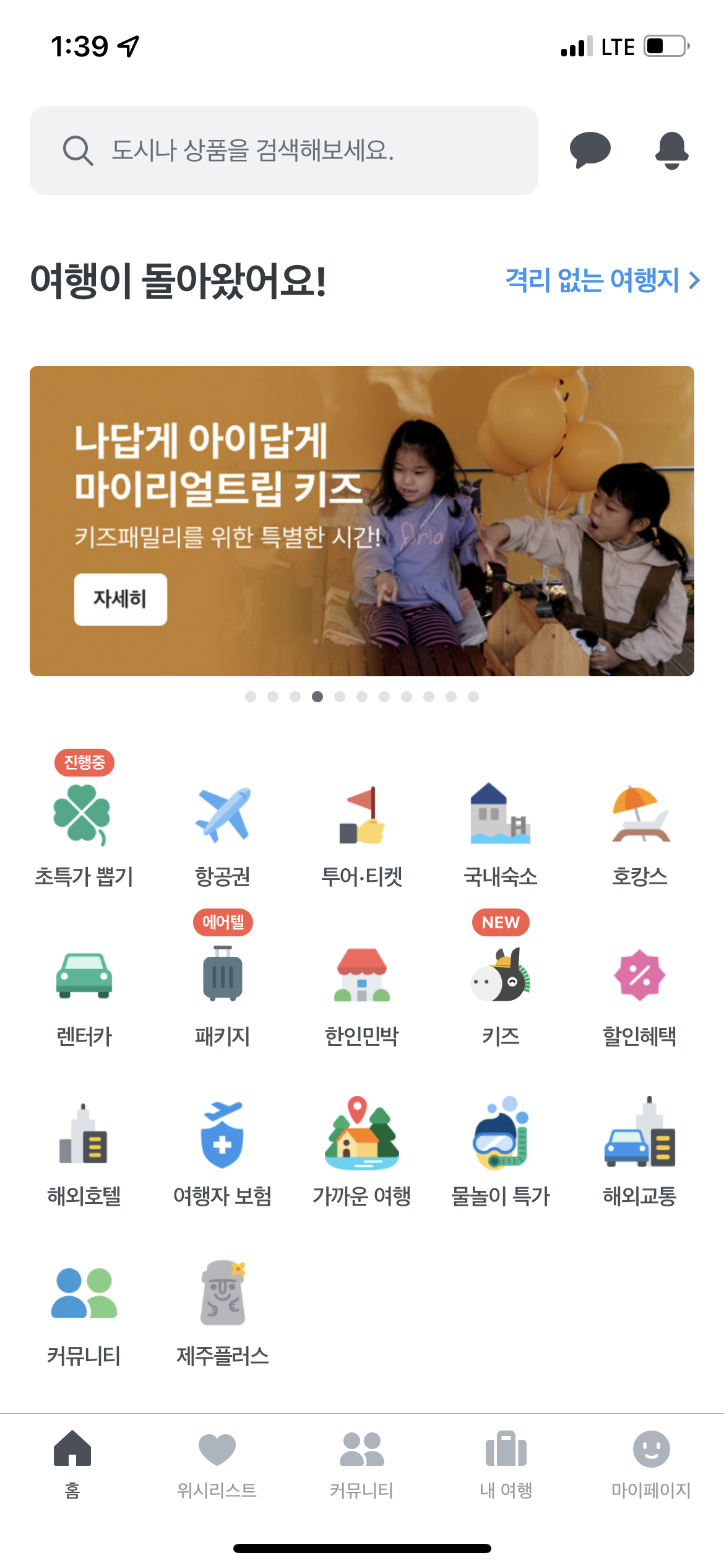 마이리얼트립도 유사성과 근접성의 원리를 활용하여 정보를 그룹화했다고 보입니다. 하지만 각 요소 간의 우선순위를 찾기 어려워 사용자가 한눈에 정보를 그룹화하기는 힘들게 느껴집니다. 첫 화면에 검색창, 여행 정보, 서비스 배너, 정보 아이콘, 큐레이팅 콘텐츠 순으로 나열되어 있는데, 각 요소의 배열 순서와 크기는 사용자에게 정보의 우선순위를 보여주고 있지 않다고 생각합니다. 그렇기 때문에 사용자가 각 요소의 정보를 스캔하고 원하는(혹은 목적하는) 정보를 찾는 시간이 걸려 직관적인 서비스라고 보기 어렵습니다. 즉, 유사성과 근접성의 원칙을 고수하는 것과 더불어 콘텐츠의 우선순위를 정하고 이에 맞게 차별화를 해야 CTA까지 고려한 UI라고 볼 수 있을 것 같습니다.