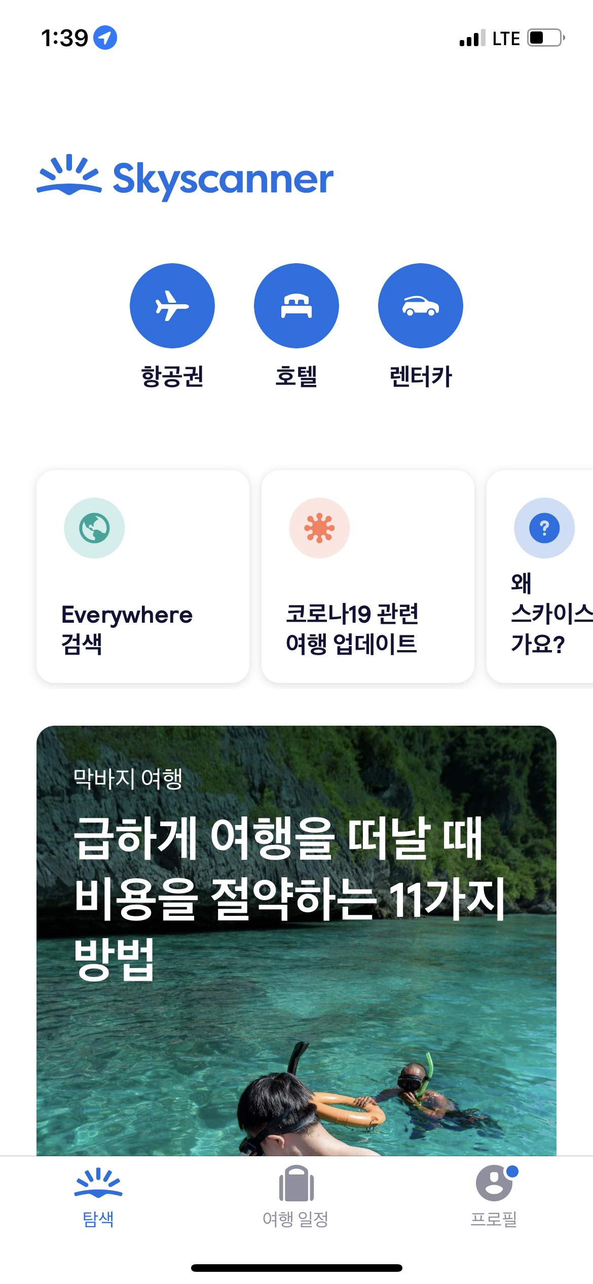 Skyscanner는 게슈탈트 이론 중 “유사성”의 원칙을 잘 실현한 사례같습니다. 어플 첫 화면에 들어가면 사용자는 콘텐츠가 크게 3가지 요소로 나눠지는 것을 알아차릴 수 있습니다. 각 요소는 아이콘의 쉐입, 크기, 컬러, 배치에서 차이를 두어 사용자가 시각적으로 요소를 구별하여 정보를 그룹화하도록 돕습니다. 디자인으로 각 요소 간 차별성을 두기 때문에 각 정보에 대한 부제를 달지 않더라도 사용자가 각 정보를 그룹화할 수 있도록 돕기 때문에 간결한 UI를 구축할 수 있는 것 같습니다.