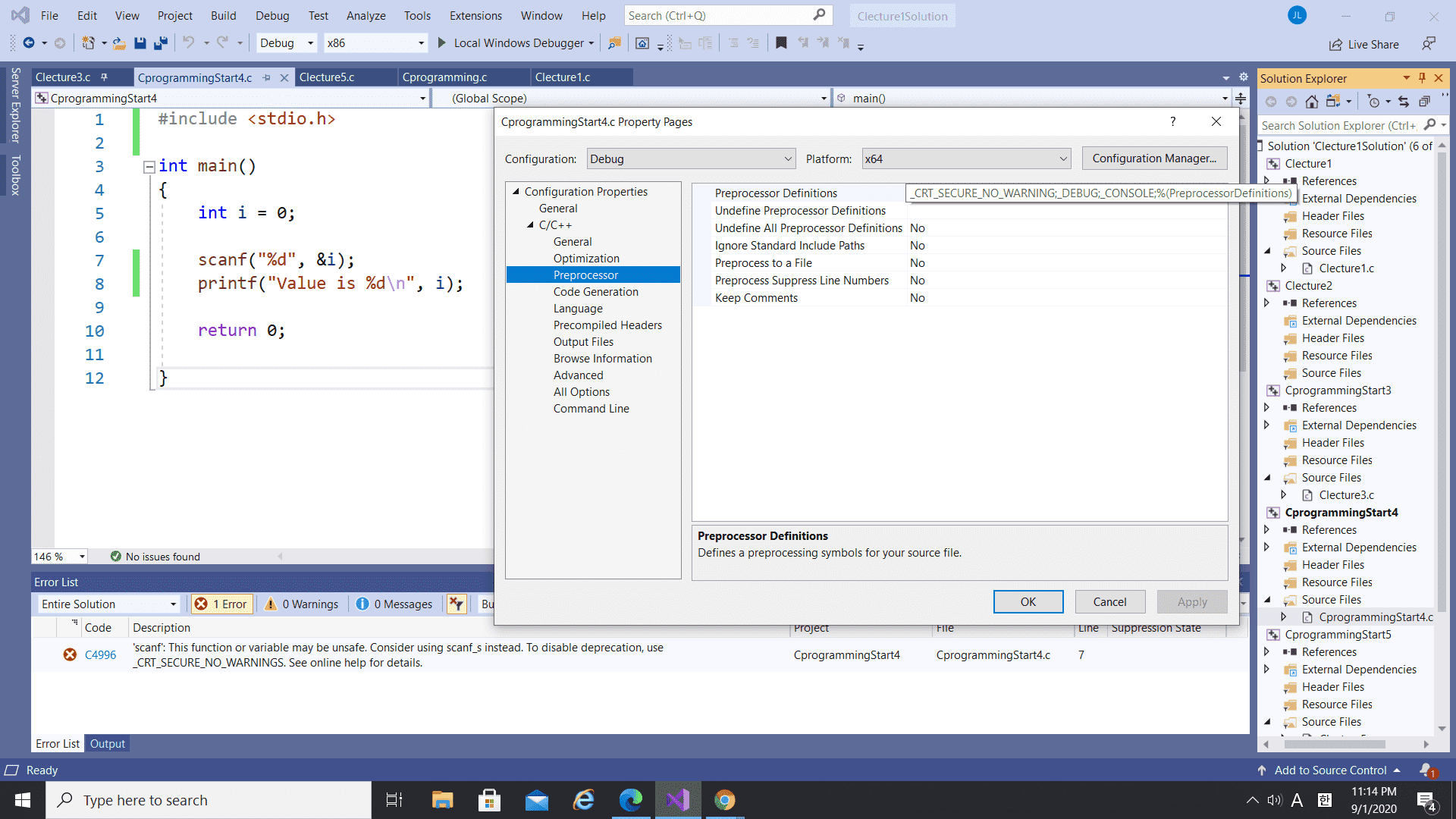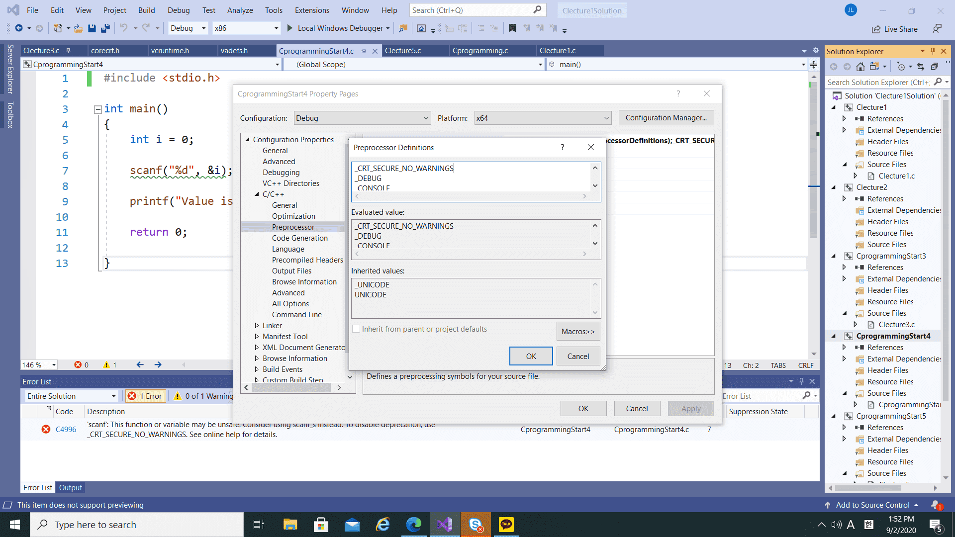 1. _CRT_SECURE_NO_WARNINGS 입니다. x64, x86은 상관 없습니다.