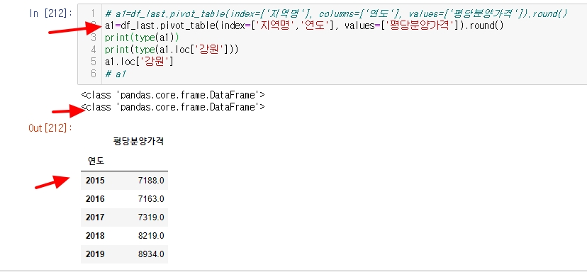 # a1=df_last.pivot_table(index=['지역명'], columns=['연도'], values=['평당분양가격']).round() a1=df_last.pivot_table(index=['지역명','연도'], values=['평당분양가격']).round() print(type(a1)) print(type(a1.loc['강원'])) a1.loc['강원']