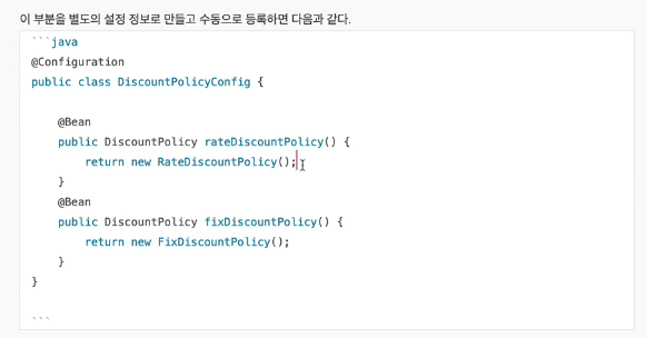 강의에서 DiscountPolicyConfig를 별도의 설정 정보로 만들고 수동으로 등록한 코드를 사용하면 DiscountPolicy 빈이 2개 있으므로 충돌이 날 거 같은데 사용할 때 별도의 이름으로 빈을 찾아오거나 @Primary나 @Qualifier를 사용해서 빈을 찾아오는건가요? 아니라면 실무에서는 해당 빈을 어떻게 사용하나요?