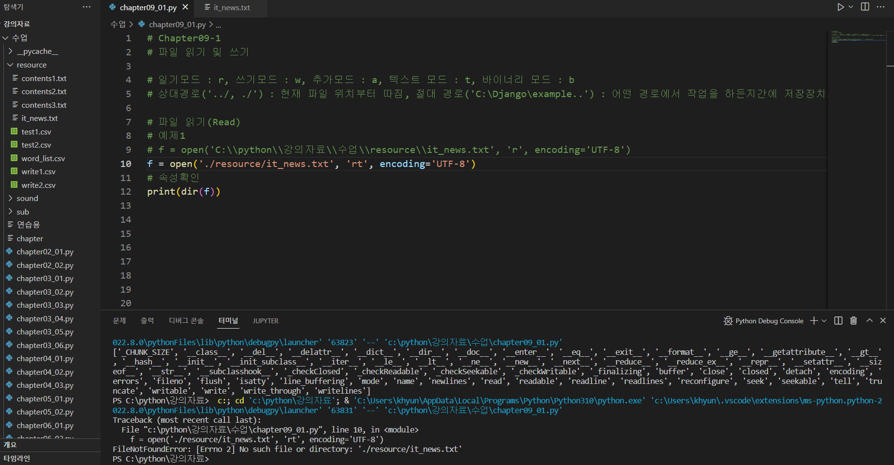 open함수 사용할때 상대경로를 이용하여 it_news.txt를 열면 오류가 납니다.