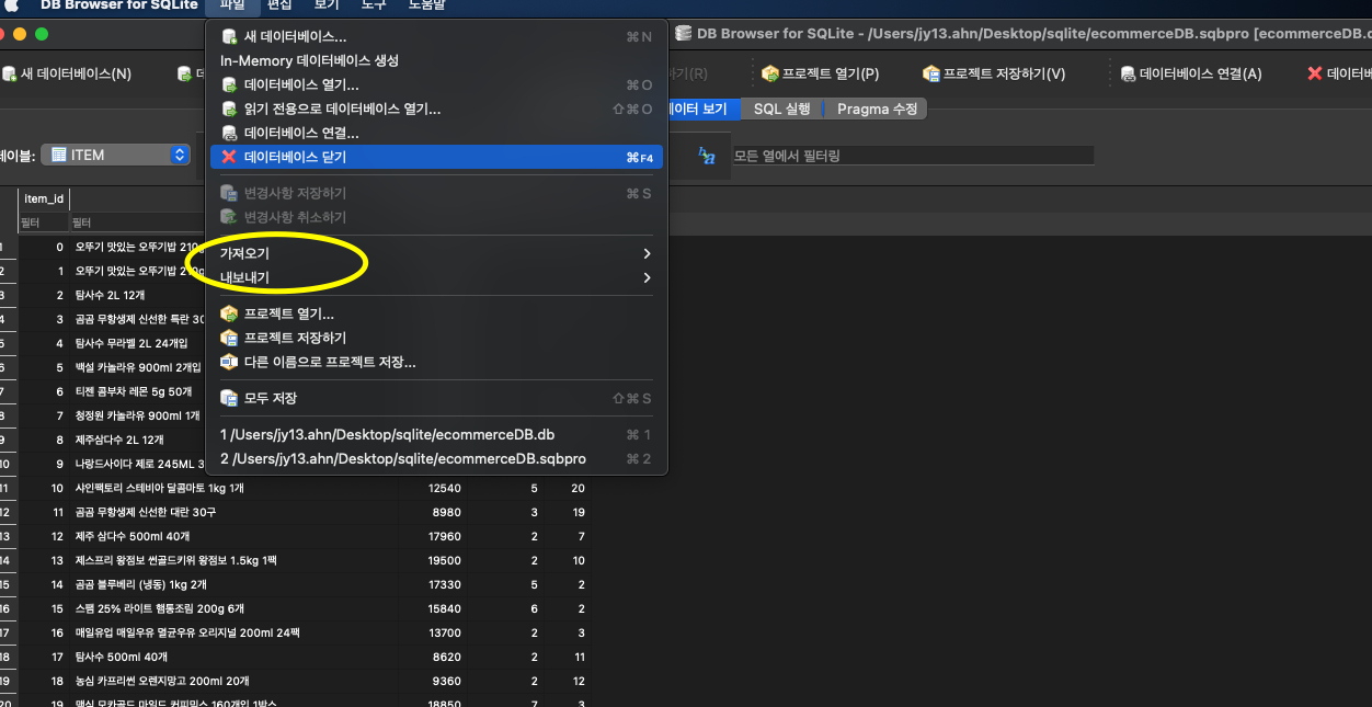 1. 우측 상단 DB Browser for SQLite > 파일 > 가져오기 > CSV 파일에서 테이블 가져오기