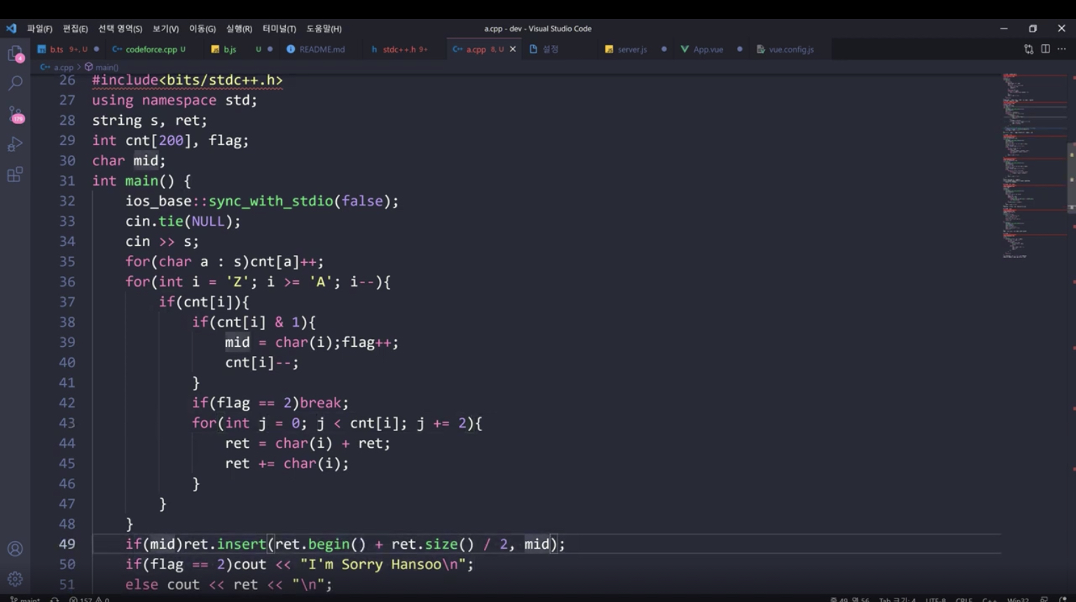1. 자자 이 문제는 펠린드롬이 되는 수 중 "오름차순"으로 하는 것이죠? 예를 들어 ABBA랑 BAAB가 있을 때 뭐가 출력이 되어야 하죠? 바로 ABBA죠? 자 그렇다면 무엇부터 붙여야 하죠?