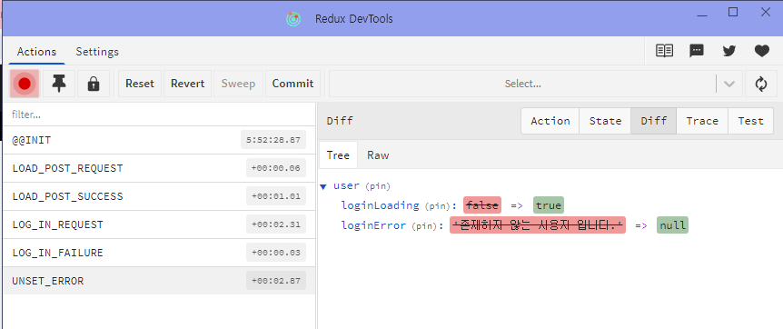 스위치 문 내에서는 상태의 변경이 없으나, 리덕스 데브툴에서는 아래처럼 제가 설정하지 않은 loginLoading 값이 변경되어 나옵니다.