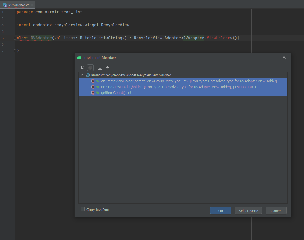 어제 하다가 ViewHolder부분을 밑에 inner class로 정의를 한후에 ok를 누르니깐 정상적으로 됬습니다.