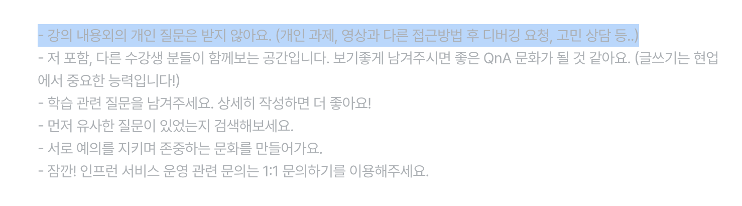 - 강의 내용외의 개인 질문은 받지 않아요. (개인 과제, 영상과 다른 접근방법 후 디버깅 요청, 고민 상담 등..)