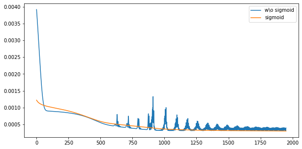 아래는 LSTM에서 sigmoid 유무에 따른 학습 손실함수 그래프입니다! (x축: epochs, y축: 손실함수 값)