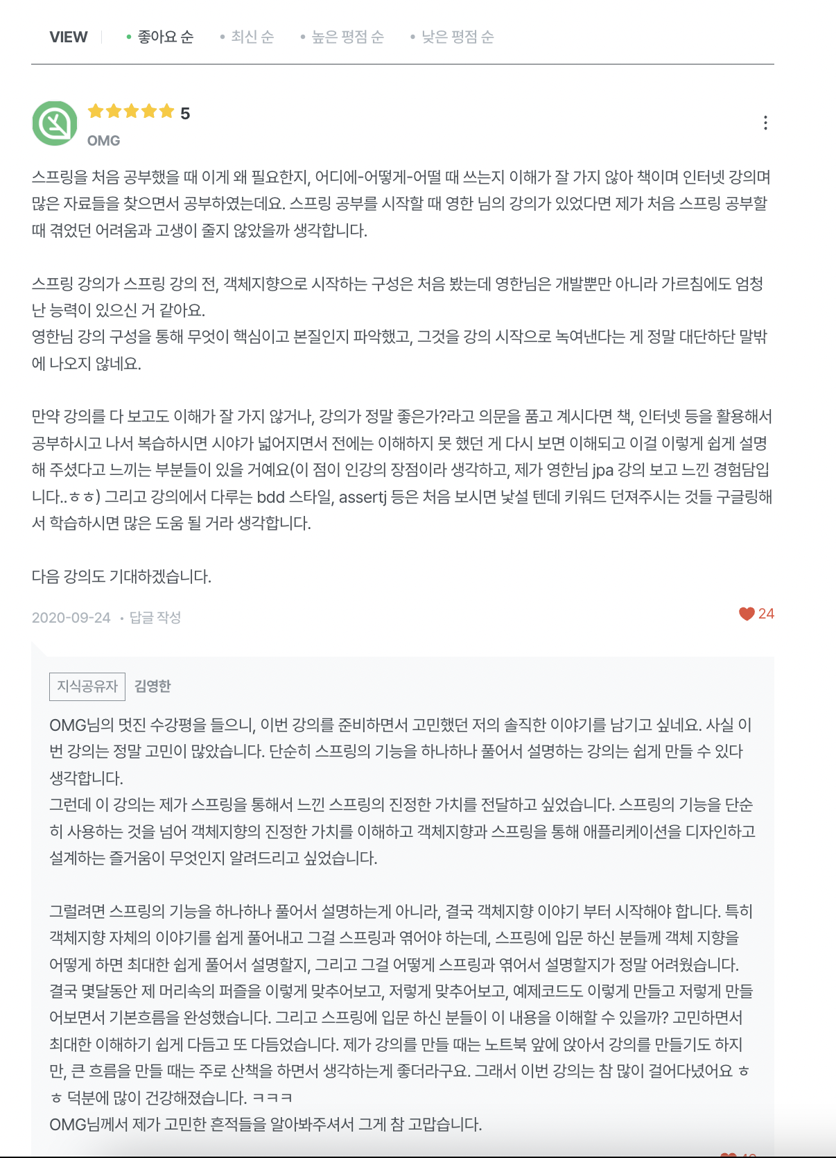 스프링 입문 강의의 수강평들을 보면 다들 극찬을 하시고