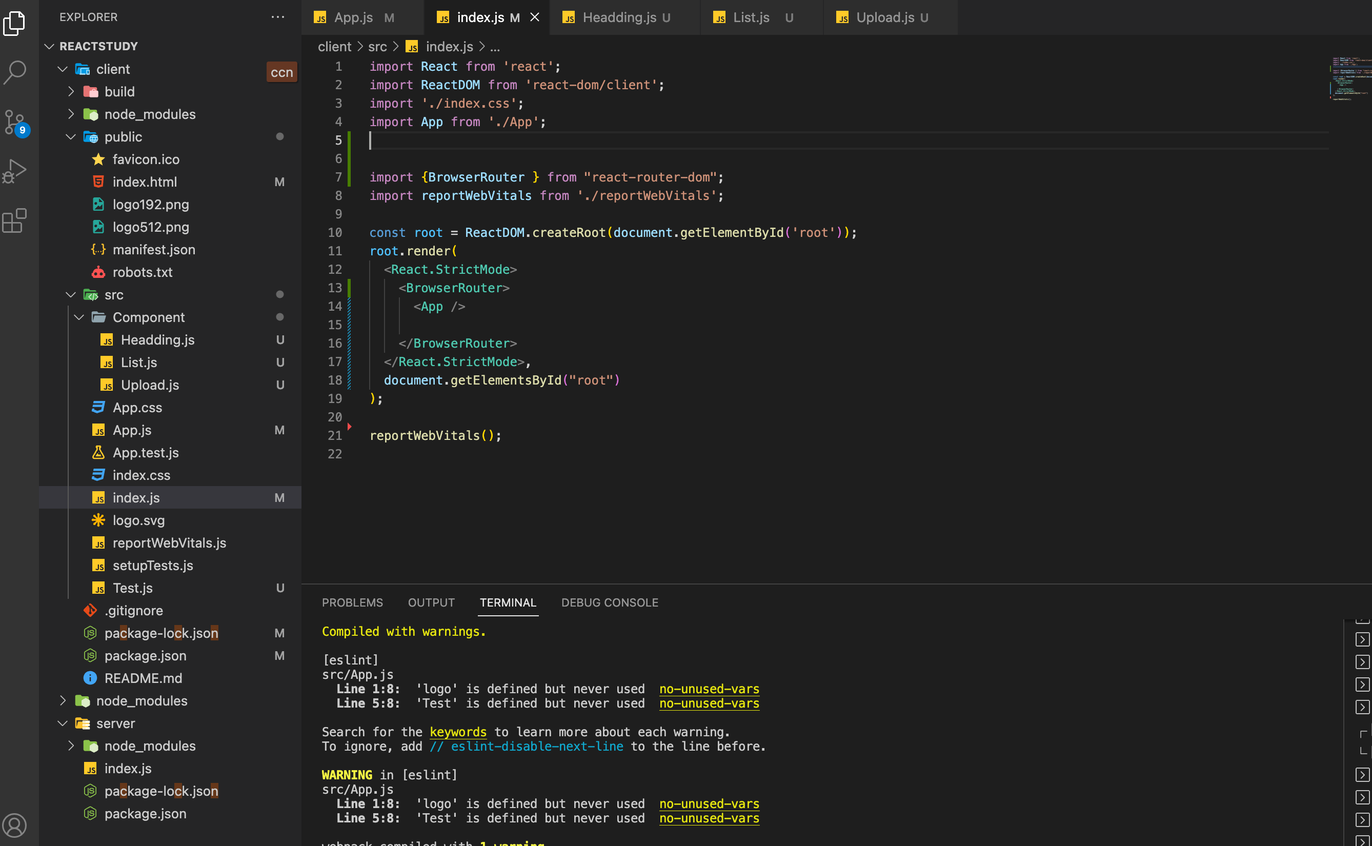 화면에 hello, react와 heading, list, upload 가 모두 나오지 않습니다.