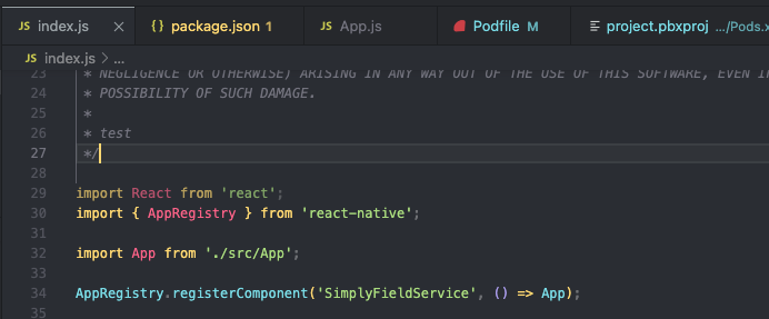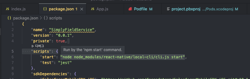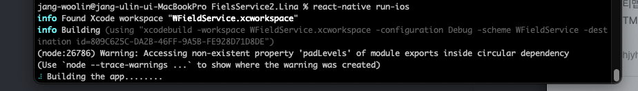 제가 생각했을 때는, 현재 index.js와 package.jsond에서 이름이 'SimplyFieldService'로 되어있는데, 터미널에서 보면 타겟을 'WFieldService.xcworkspace'로 잡고 있어 빌드를 못하는 것 같습니다.
