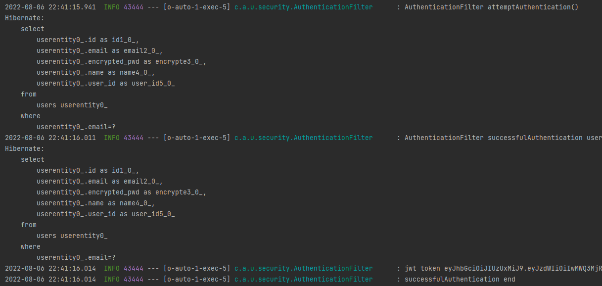 위 2 부분에도 이상이 없다면, 작업하신 AuthenticationFilter.java 클래스를 공유해서 주시면, 해당 파일을 가지고 제쪽에서도 한번 테스트 해 보도록 하겠습니다.