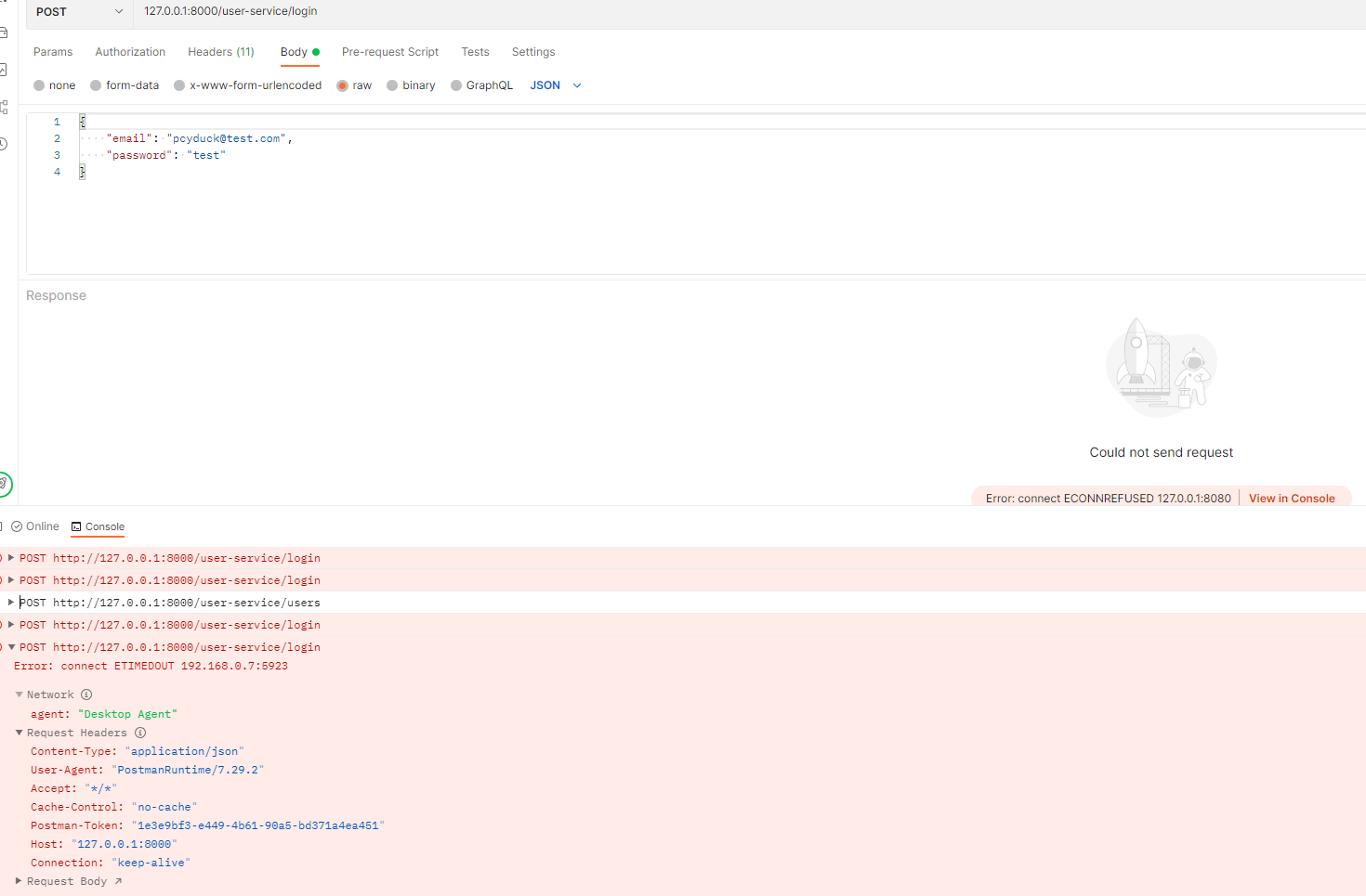 포스트맨 /login 전송시 타임아웃으로 200번 정상 응답을 받아오지 못하고 있습니다.