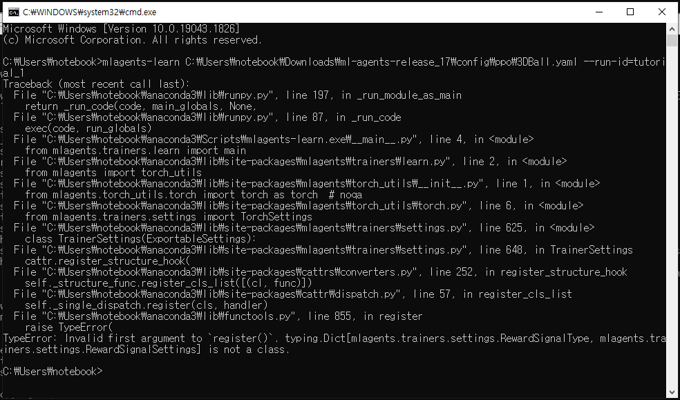 pytorch를 pip으로 설치 후 unity mlagents를 강좌와 같은 17 release brach로 다운받아 사용해봤는데, 이렇게 에러가 떠서