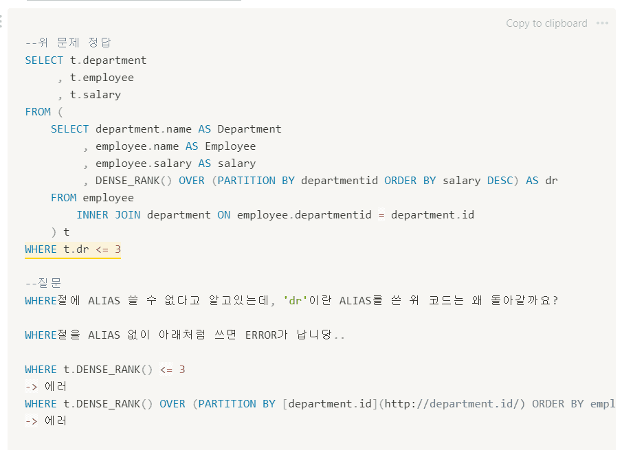 -질문: 다른 절에 적어 놓은 ALIAS를 WHERE절에서 끌어와 쓸 수 없다고 알고있는데, 아래 정답에서 dr은 왜 돌아가는지 궁금합니다.
