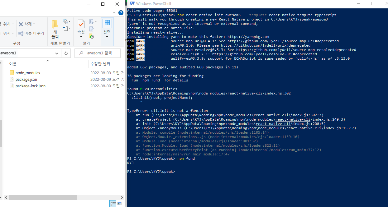 2. 최신버젼 react-native는 cli.init is not function 에러 발생하면서 실행 불가.