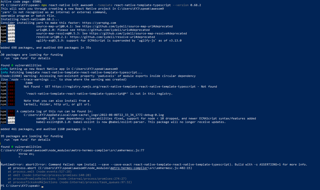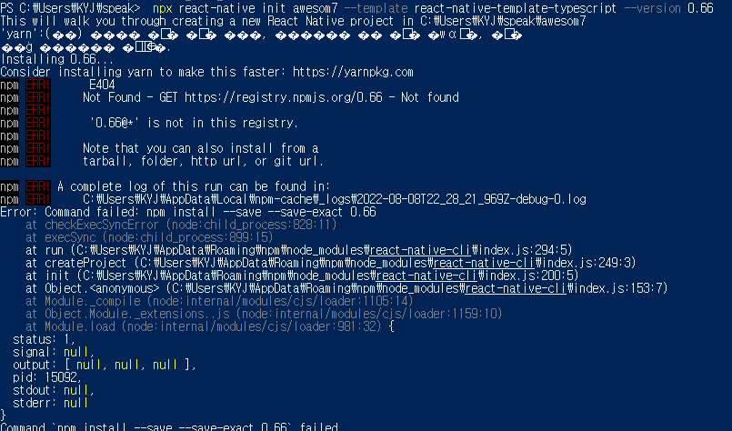 yarn을 설치하신 분들께서 주로 이런 에러가 나는 것으로 보아, yarn과의 충돌이 있는 모양입니다. 그냥 --version 없이 최신 버전으로 설치하시거나 제 깃헙 settings 폴더에서 출발하시면 됩니다.