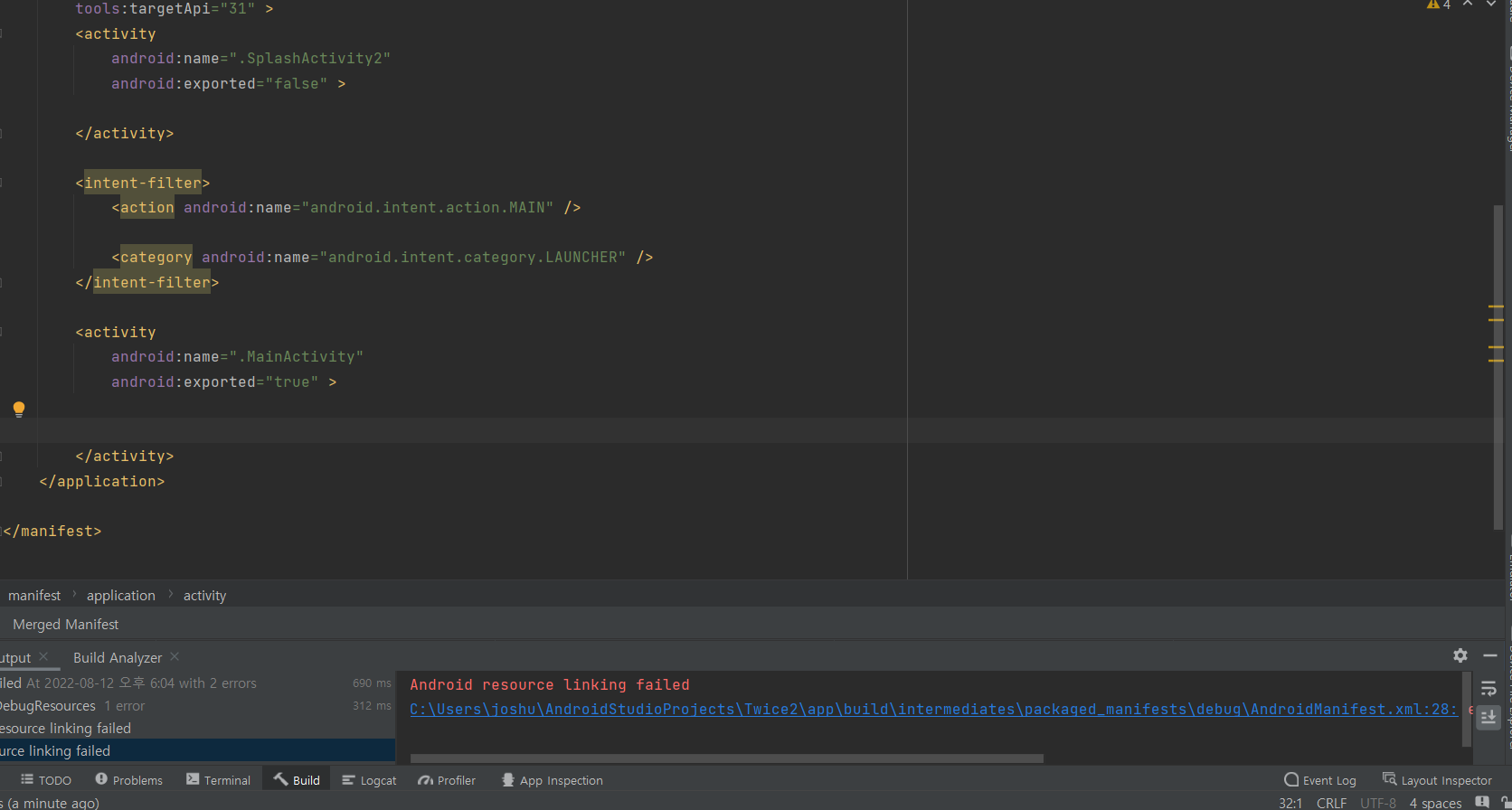 인텐트 필터 안에 내용을 어떻게 고쳐야 할까요? 화면 위 내용은 밑에 와 같습니다.