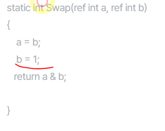 internal class Program { static int Swap(ref int a, ref int b) { a = b; b = 1; return a & b; }