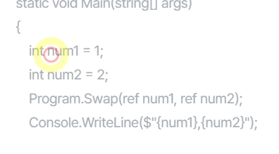 static void Main(string[] args) { int num1 = 1; int num2 = 2; Program.Swap(ref num1, ref num2); Console.WriteLine($"{num1},{num2}");
