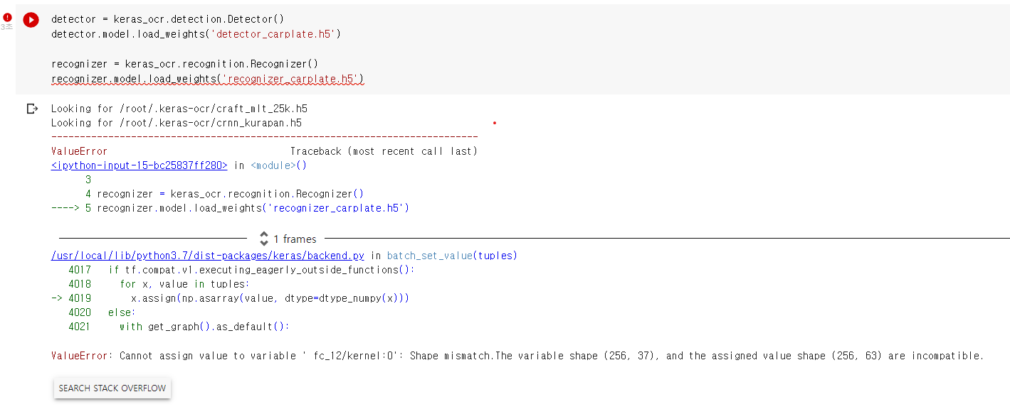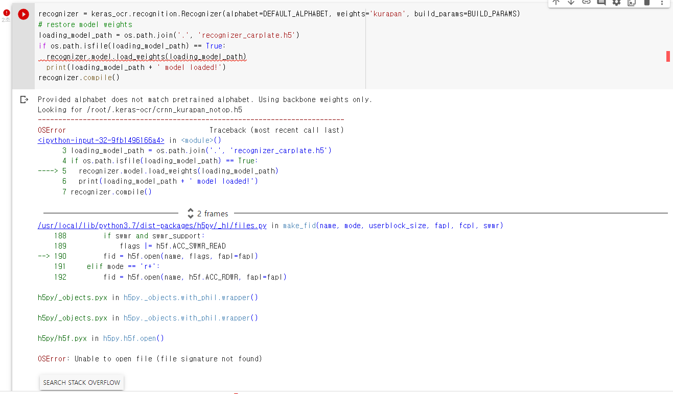 recognizer_carplate.h5라는 파일이 작업환경 내에 제대로 존재하고 오염되지 않는 상태(파일 크기가 충분한지)로 있는지 확인이 필요할 것 같습니다.