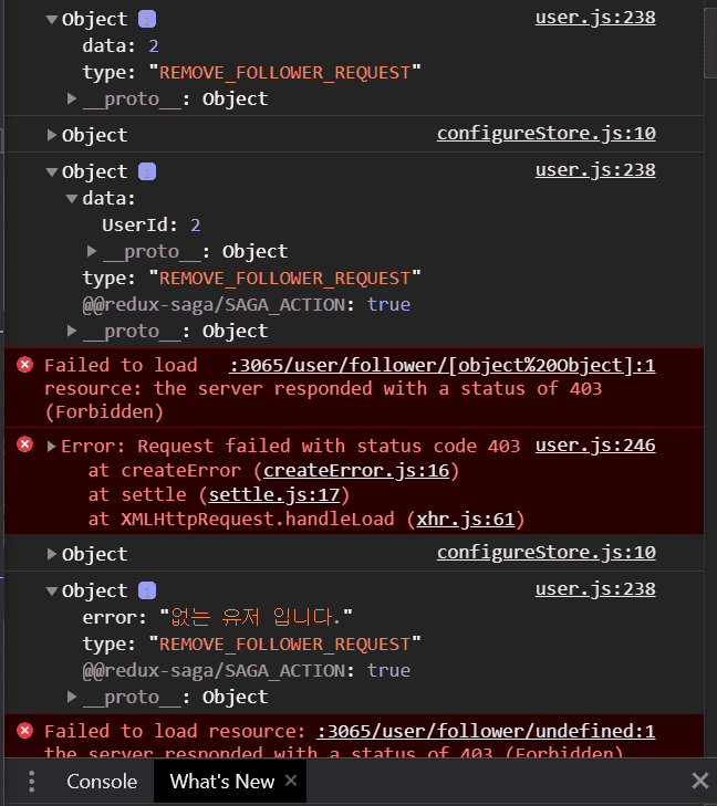 혹시 saga에서 REMOVE_FOLLOWER_FAILURE 대신 REMOVE_FOLLOWER_REUQEST 넣으신 거 아닌가요? 에러날때 다시 REQUEST 액션이 호출되네요.