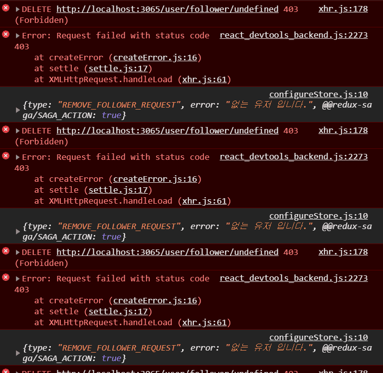 하나 의심되는 점은 DELETE /user/follower/undefined가 뜨는데 사용자 아이디가 undefined네요? saga쪽에서 action 한 번 로그 찍어보시는 게 좋을 것 같습니다.