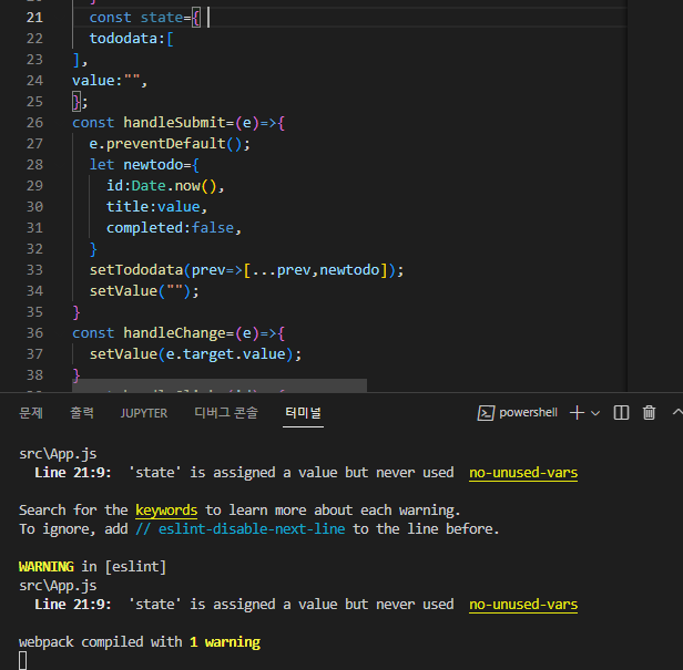 이 부분은 state를 정의만 해놓고 쓰지 않아서 나오는 경고입니다~