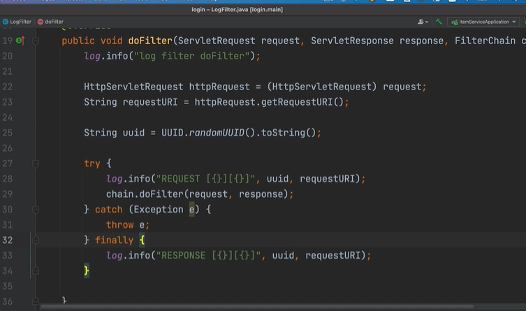 여기서 throw e해서 예외를 던지면 doFilter에서 LogFilter로 예외를 전가할텐데