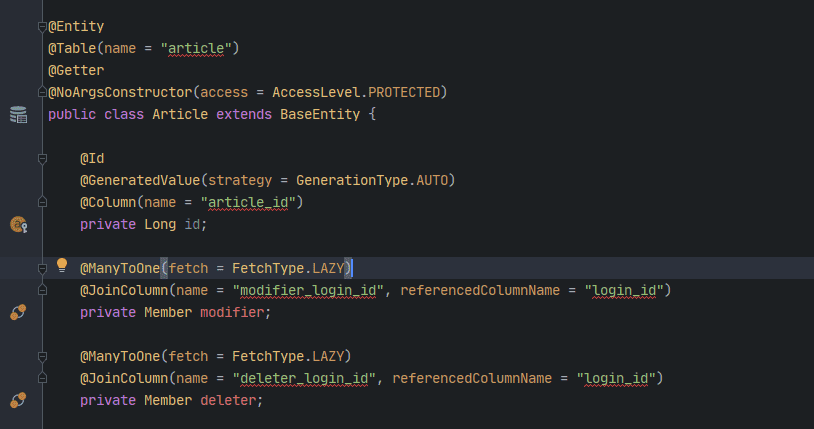아래 그림과 같이 Article에서 Member를 ManyToOne으로 세개의 다대일 단방향을 만들었습니다.