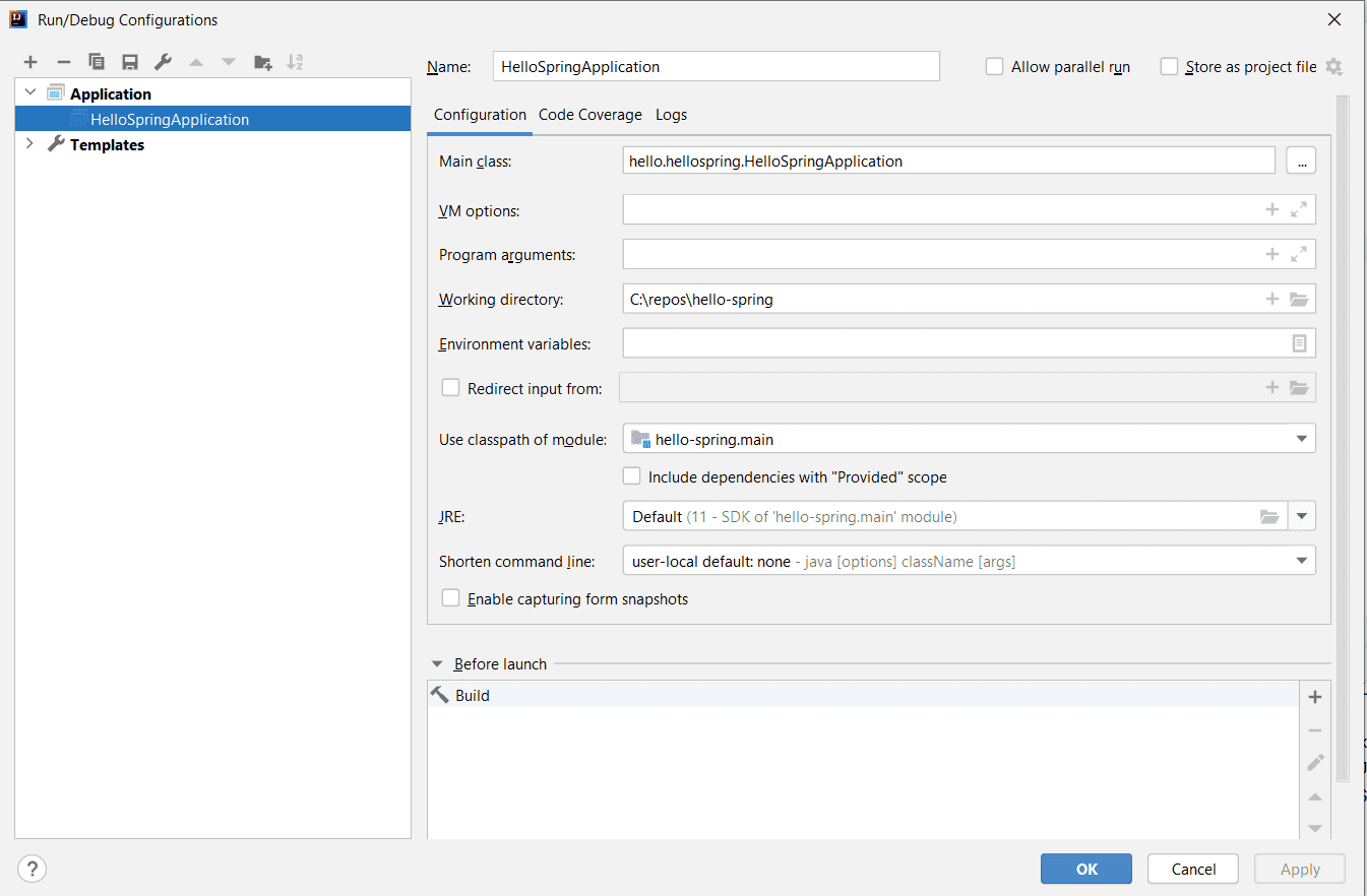 다른 자료들을 확인해보면, Run/Debug Configurations 에 SpringBoot로 나오던데 저의 경우에는 Application으로만 나오더라구요.